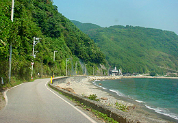 ←自然な感じの狭い砂浜。 佐渡海峡側(南側)と両津湾から内海府海岸側(東側)の道は少し細い箇所もあったけど比較的なだらかで、海のすぐ脇を走る部分も多くてのんびり走れた。 |