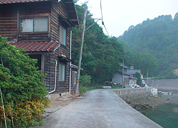 | ↑大芝南。朝靄の瀬戸内海。 over! 靄の中に小芝島がみえた。 大芝東の北の辺→ ローカルな小さな小学校や民家の感じもいい感じ、傍目には平和そうないい感じの島だった。 |
