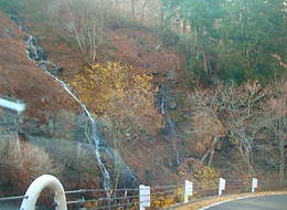 峠を下ると道の脇に岩肌を滑るような滝が見えた。
