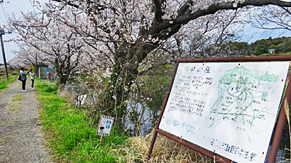 で、川はちょっと淀んで濁っててイマイチなんだけど、桜が咲くと覆いかぶさるように濃く咲くのでなんかいい雰囲気。橋からちょこっと見るだけのつもりだったけど歩きたくなったので川沿いに進んでみた。