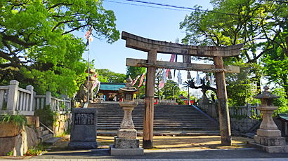 なにはともあれ朝の神社は清々しくお参り、鳥居をくぐって石段を上ると鯉のぼりが吊られてた。