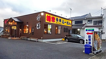 さて、なんか前回来た時は「小見川餃子」の表記が思いのほか無くてアレ?っと思った気がするけど、今日来たら駐車場前の自販機の裏に大きなパネルであった。「小見川名物 香湯ぎょうざ」
