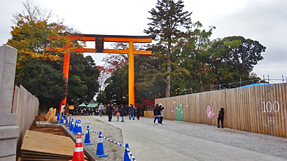 混雑を避けて横に出て、かこいの中の赤い本殿は八坂神社。その裏にまわって氷川神社の本殿の前の絵馬トンネルをくぐった。ここがこの神社の一番キャッチ―な見どころかな。