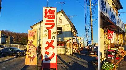 一目で目につくおおきな「塩ラーメン」の看板で気になりつつ暖簾が掛かってやってそうなのも見えて、一旦通過しちゃったけど、まわって戻って来て手前の駐車場に停められた。
