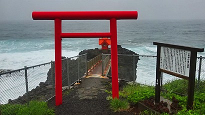 傘は差さない方がよさそうなので、軽く濡れながら渡って拝んで、飛び交うウミネコを眺めた。