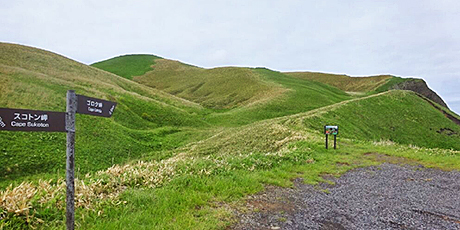 まずコースはすっきりした草原の高原の丘の道なので写真の通りの道筋がよく見えてて迷う心配もないし、なにせ島には熊も鹿も蛇もいないという安心感がいいね。背中の北方向を振り返ると鮑古丹の浜からスコトン岬への湾曲の丘が見えてすでにいい眺めだった。