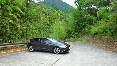道路からは覗けない深そうな峡谷だから、かなり下って登って戻らなきゃいけないのかなぁと思ってたけど、道の駅の観光案内で聞いたら「駐車場は国道から下った所なのでそんなに歩かないですよ」というので、来てみた。ら、たしかに下る脇道の先が駐車場になってた。谷の下ではなくて中間くらいだから少しは上り下りがありそうだけど、まぁ思ってたよりは全然イイかなと思って歩いてみた。