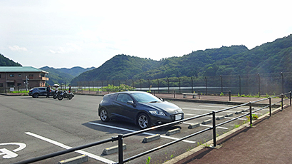 広い駐車場があったけど、端には高い柵が張り巡らされてて、まわって歩けばロックフィルのダムの上を歩けるっぽかったけど、暑かったのでここから見るだけでいいやと、柵越しに覗いて眺めた。