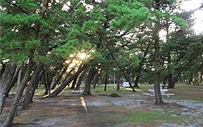 そしてさっそく浜辺に移動。松林の公園はまた横断するだけ。ホントは少しは早く来て園内のグネグネの松の木を見たりしたかったけど、横目に見るだけ。松林にさす夕日とかいい感じだったけどね。