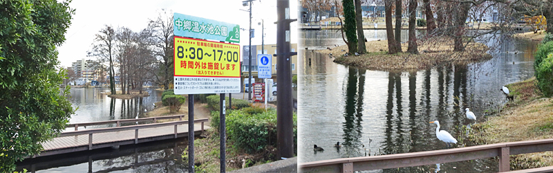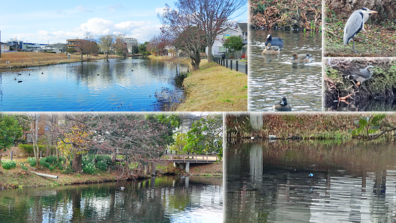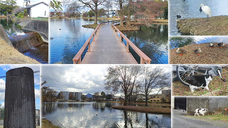 頭上を飛ぶシロサギを見つつ進むと、こっち側は用水路に流れ出してて公園の出口。東側の道は池への橋を渡ってまわれた。なかなか散策するのに変化あって楽しい公園。