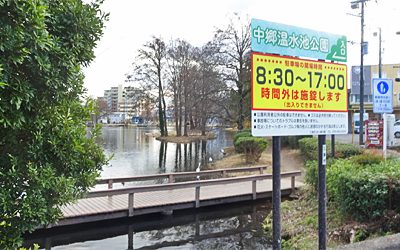ここは表の通りには面していない宅地内だけど、広い池の公園で駐車場もちゃんとあった。