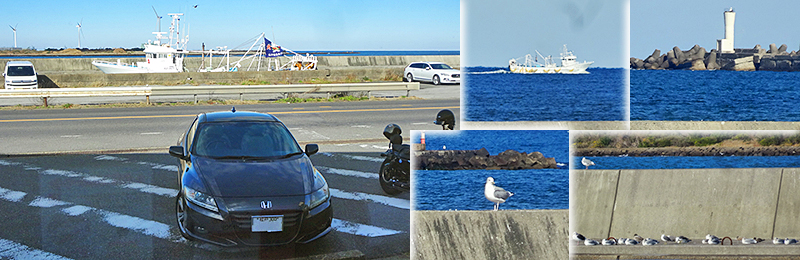 目の前の漁港内では帰って来た漁船が通過したりしてたし、港の外でも走っていく船が見えた。