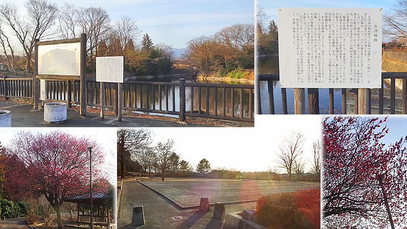 その池の前から振り返った向かいに公園の広場があった。こっちの方が城跡なのかな?とか思えたけど、そういう表記はなかった。っていうか、大きく見事な紅梅がいい感じに満開で咲いててキレイだった。そういえば今日は城跡よりも梅のスポットを探して廻ってたんだっけ、、ということで補完できた気がした。