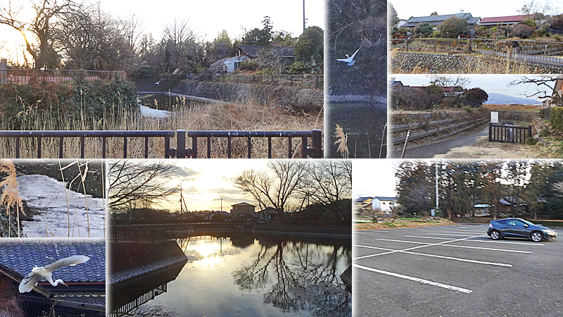 横から見ると本丸の裏の堀は水面に白い箇所があって凍ってるように見えた。そしてそこにいたダイサギが逃げるように飛び立った。この距離で逃げるかね。