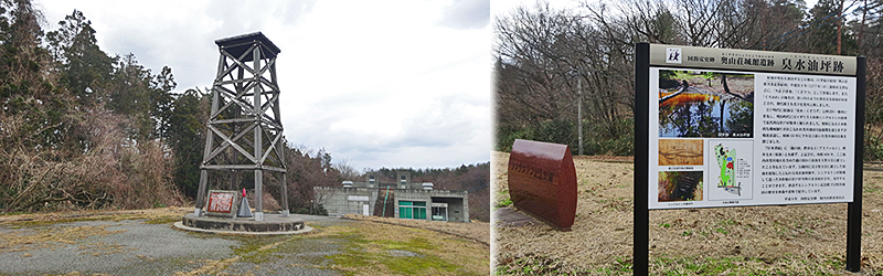 で、そんな日本唯一と誇れそうな歴史もある遺跡でもある公園だけど、表の国道から真っすぐ来る道はなく、マイナーな細い集落を抜ける道で来てみたら、駐車場はあったけど線は引かれてなくてはっきりせず、公園の入口も「臭水油坪跡」という案内とシンボルタワーという木組みの櫓はあったけど、なんとなく他は雑で荒れた感じで勿体なく思えた。