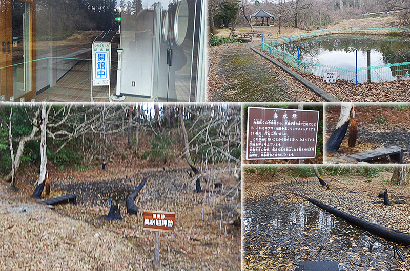 けど、そういえば駐車場の前にある花壇のような囲みに気付いて寄ってみたら、ここも原油の壺っぽく黒い水が溜まってた。「火気厳禁」も立ってて本物だった。どのくらいの火がつくのか興味あるけど火気持ち合わせないし、持ってても勿論試すほどの馬鹿ではない。記念館の方にはどのくらいの火が付くかとかあるのかなぁ。勝手に想像しつつ車に戻った。