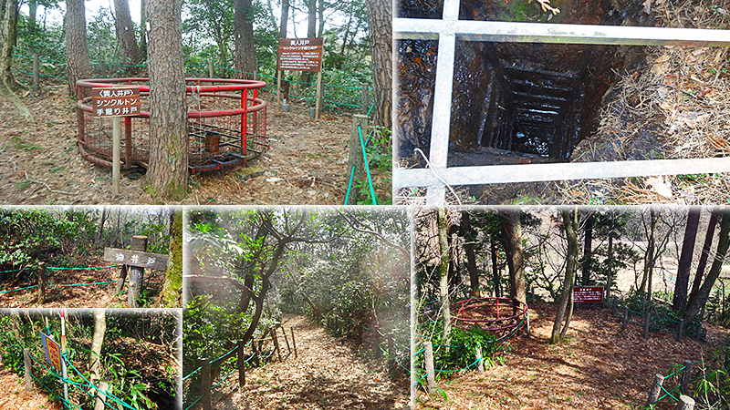 そこから土塁のような小さな尾根の山道を進んでみたら、あちこちに井戸の穴が開いてた。