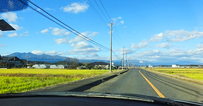 何度も通ってる道で丘に挟まれた田圃の道。ミラーの背後の西日が攻撃的なくらい眩しかった。