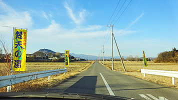 そんなわけで難なく岡本に進んで彼岸花ロード。途中でトイレ休憩した駐車場への横道も雪のユの字もなかった。いや、本当は道路以外の田圃に真っ白な雪景色を見たかったのかもしれない。気楽に走れたのはいいけど些拍子抜けな感じもしてた。