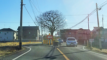引き続きナビに従って進むと、木をよけて車線別れたとこがあった(反対側に庚申塔があったそうだ)。宅地の外なので道そのものをずらして通せばよかったのに、、と思ったけど、ドライブ的にはアクセントある道でおもしろい。