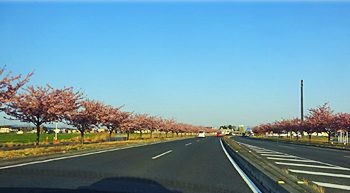 バイパスの広い道の脇には道の駅にもあった若い河津桜が長い事並んでたので、周りの車から抜け出してちょっと気分よく駆け抜けてみた。