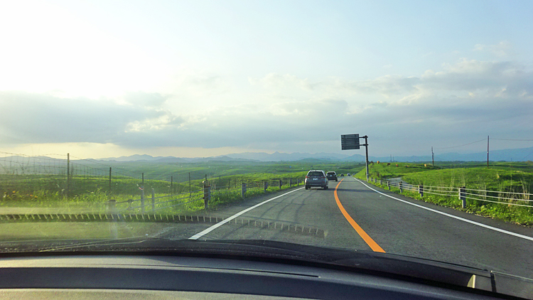 そしていよいよ「阿蘇くじゅう国立公園」の高原の道。高原の山うねうねの草原に出ると、すっきり青空見えて横目に西日が雲から顔を出して眩しく丘を照らしていた。いいねいいね。気分湧くねぇ。