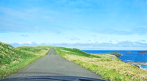 10時過ぎの出発。岬の復路は昨日も往復した海沿いの道道。やっぱ晴れてるとイイ。丘は高く聳えてかっこいいし海は煌めいてるし対岸の金田ノ岬もハッキリ見えた。