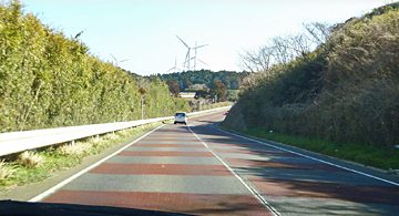台地の上の風車だらけの広い畑の道。銚子のこの台地は幾つもの皺のような谷が細く裂けてて、何本もの橋を渡りながら風車を縫って進む広域農道。