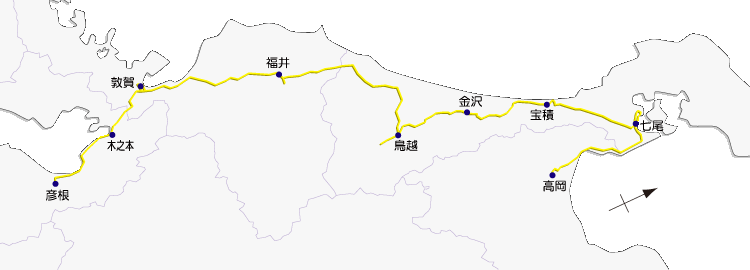 彦根~県道~木之本~8号~敦賀~8号~武生~県道~福井~8号~小松~360号~鳥越~157号~鶴来~県道~金沢~159号~宝達志水~159号~七尾~160号~高岡