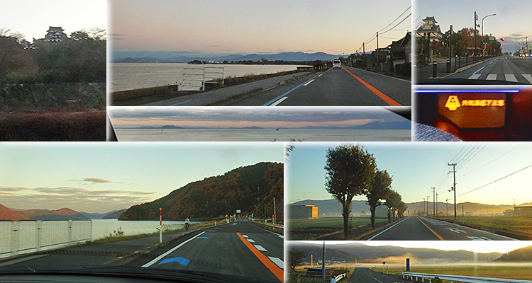 すいすいガラガラで朝日昇る前の仄かに赤らむ湖面がいい感じで快走。長浜では長浜城、模擬天守の方が立派に見えるのは些と癪だけどカッコいいから仕方ない。気温は低く、3℃以下に下がって外気温低下注意の標示が出た。