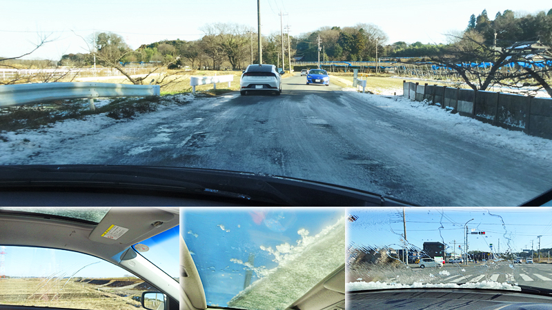 でも、そこ抜ければ日当たりイイとこではポカポカで、屋根に残った雪もやっと融けてきた。右カーブでは左の窓に水が流れて、左カーブで右窓に水流、そして信号で止まると前面に水で、印西木下でやっと雪が落ちてきて天井に青空が見えた。おもしろかった。(地域によっては交通違反らしい)