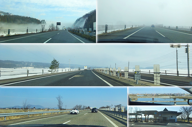 8時痼過ぎの出発。なんか時間余裕すぎじゃない?とゆったり走行。道もすいてたし霧も晴れてきた。雪国の白く広い田圃は、長岡で一気に茶色く融けててスパッと雪国終了。関越道も終了して北陸道に入った。